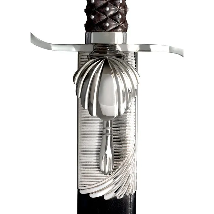 Het jachtzwaard is een wapen met een kling van max. 65 cm dat tijdens de 16de en 17de eeuw vrij populair werd in Europa en de VS. Het was een mode statement, maar daarnaast ook effectief, handig en het juiste formaat om overal mee te dragen. Deze replica van Cold Steel heeft een sterk gepolijste kling en heeft meerdere bloedgoten. Het mooie handvat is gemaakt van Maleisisch hout en is gedecoreerd met pinnetjes van nikkel. De schede en de stootplaat hebben een elegant schelpvormig ontwerp. De schede is gemaakt van hoge kwaliteit zwart leer.