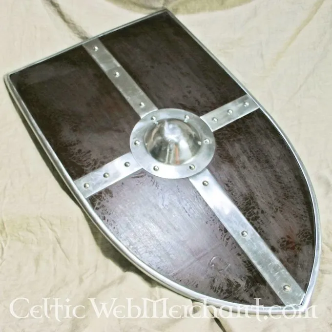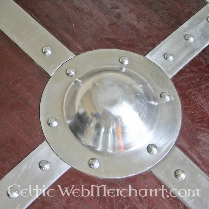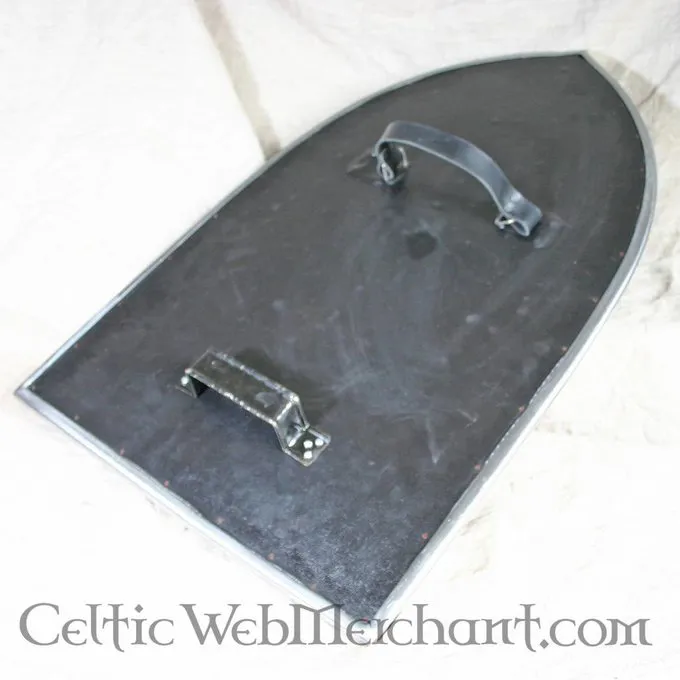 Dit schild is met staal beslagen voor de stevigheid. Hij is 64 cm hoog, 49 cm breed en heeft een gewicht van 2,2 kg.