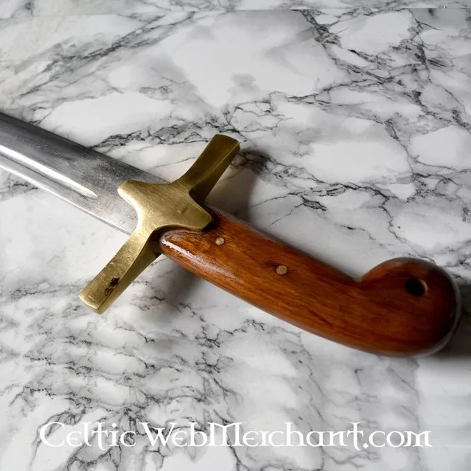 Details: Materiaal: EN45 verenstaal, hout, messing / Totale lengte: 97 cm / Klinglengte: 79,5 cm / Pommel: geschroefd / Volledige tangconstructie / Gebaseerd op historisch origineel / Snede: semi-scherp / Gewicht: 1210 gram /