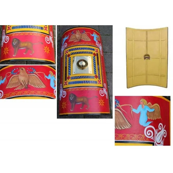 Deze scutum is een replica van een laat-Romeins schild uit de 3de eeuw n.Chr. Het origineel is teruggevonden in Dura Europos (Syrië). Het schild is het enige exemplaar waarvan bekend is hoe hij beschilderd is. De Romeinse scuta boden goede dekking voor soldaten en maakte de testudoformatie (schildpadformatie) mogelijk.