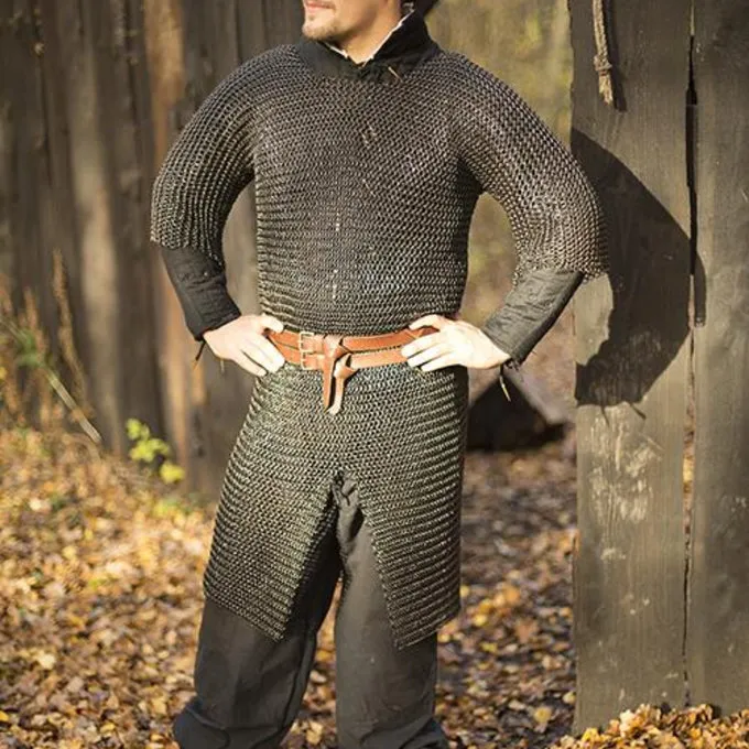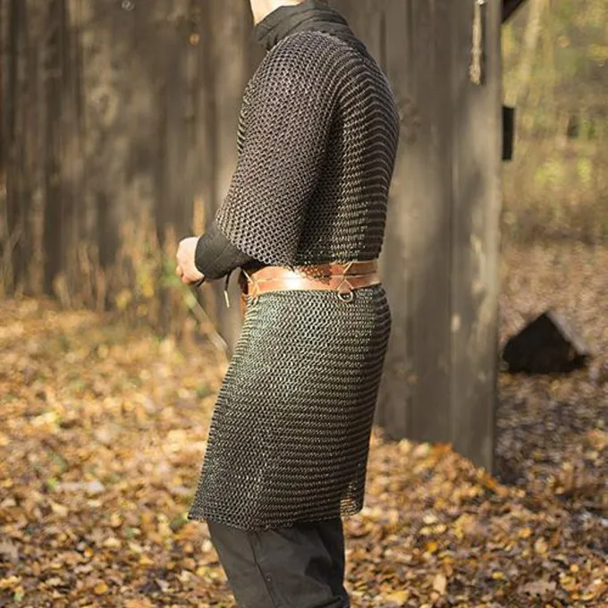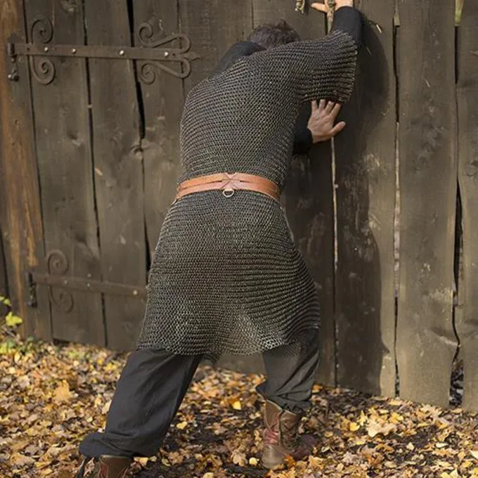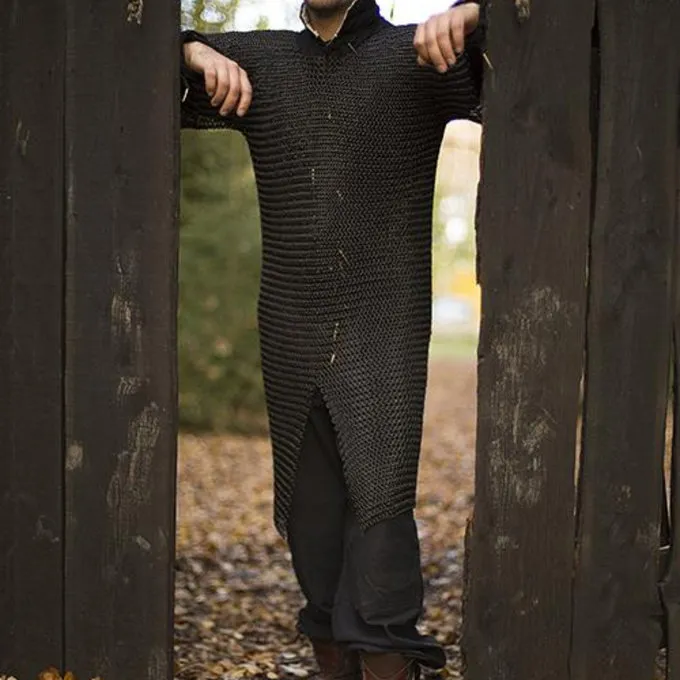 Dit type maliënkolder werd veel in de middeleeuwen gebruikt. De split zorgt ervoor dat hij ook gemakkelijk te paard gedragen kan worden en de beweeglijkheid van de drager zo min mogelijk belemmert. De hauberk heeft halflange mouwen en is gemaakt van mild steel.