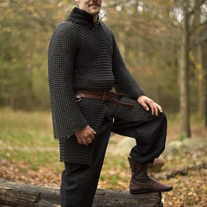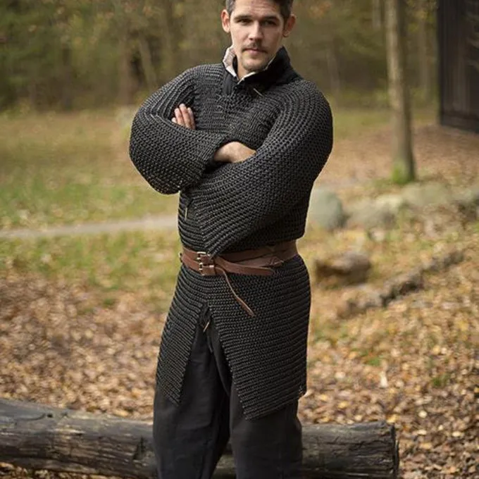 Dit type maliënkolder werd veel in de middeleeuwen gebruikt. De split zorgt ervoor dat hij ook gemakkelijk te paard gedragen kan worden en de beweeglijkheid van de drager zo min mogelijk belemmert. De hauberk heeft lange mouwen en is gemaakt van mild steel.