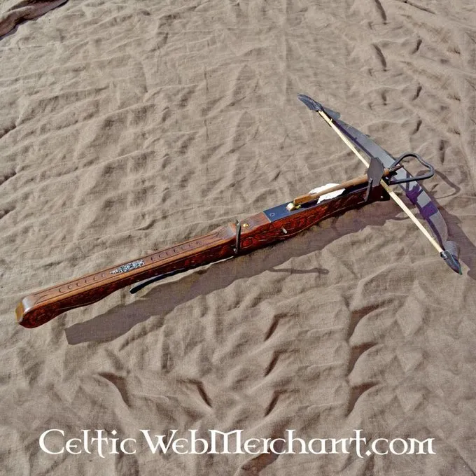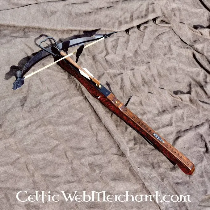 Deze decoratieve kruisboog is 77 cm lang. Hij is voorzien van ijzeren werparmen.