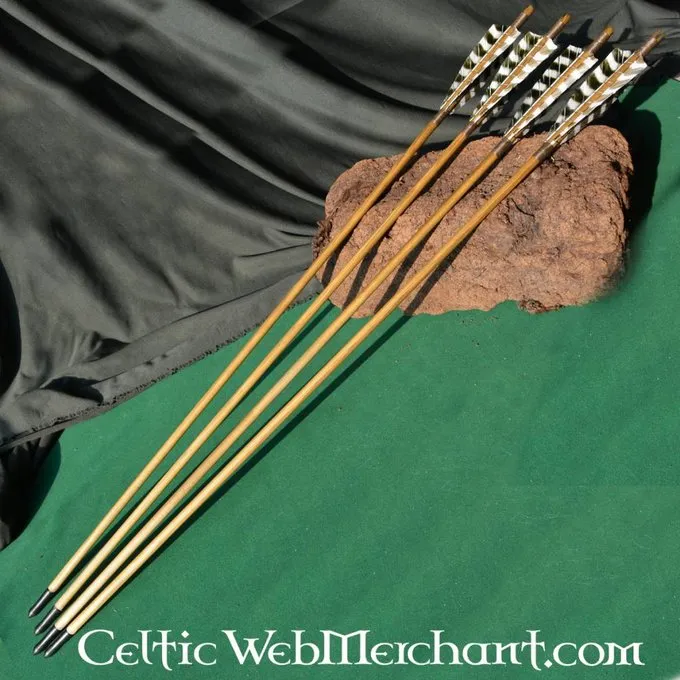 Deze authentieke pijl is gemaakt van sparrenhout en heeft een ingezaagde nok. Hij is ongeveer 79 cm lang en is geschikt voor bogen met een trekkracht van 60 tot 70 pond (27 tot 31,5 kg). De veren zijn van natuurlijk materiaal en zijn met bronsdraad bevestigd. De punt is een replica van bestaande pijlpunten.