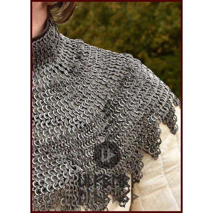 Maliënkragen zoals deze werden in de 15de en 16de eeuw in geheel Europa gedragen. In de 16de eeuw was zij zeer populair bij de Duitse Landsknecht en de Schotse en Ierse Galloglass. Dit type maliënkraag werd ook wel bisschopsmantel genoemd. De kraag is voorzien van leren riempjes met replicagespen. De onderkant van deze kraag is gemaakt van messing maliën. Deze maliënkraag is gemaakt van gemixt geklonken platte ringen, ronde klinknagels in de 1:4 constructie.