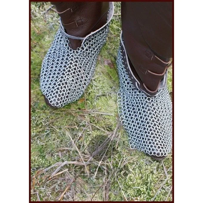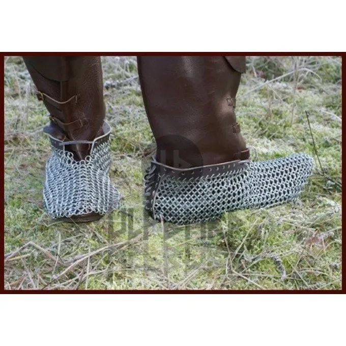 Deze maliënschoenen kunnen gemakkelijk over historisch schoeisel worden getrokken. Ze zijn gemaakt van verzinkte, ongeklonken ronde ringen met een binnendiameter van 8 mm. Ze laten de zool open en zijn aan de bovenkant afgezet met een leren rand.