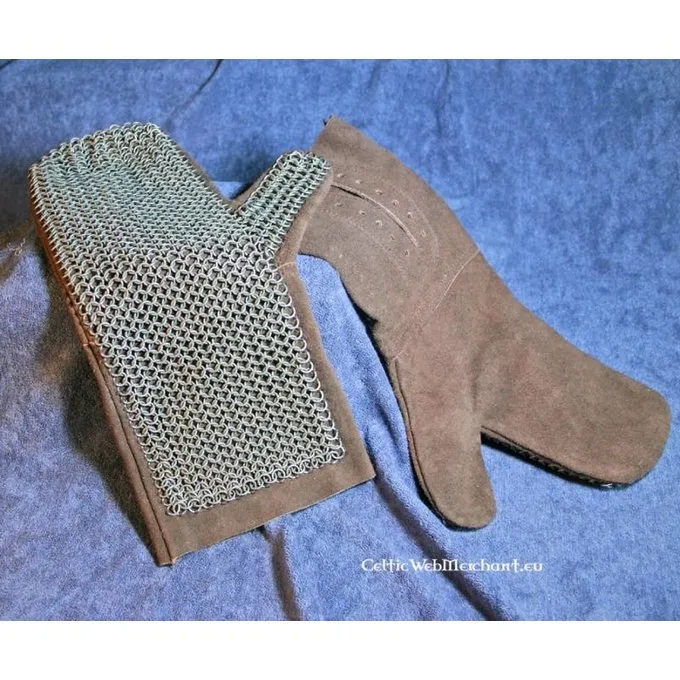 Deze wanten zijn gemaakt van zwart suèdeleer, waarop op de bovenkant gevlochten maliënringetjes zijn bevestigd. Op de rug van de hand is onder het maliën een wollen padding aangebracht voor extra bescherming. De ongeklonken ronde ringen zijn 1,6 mm dik en hebben een binnendiameter van 6 mm. De handschoenen zijn geschikt voor de handschoenmaten 9 en 10 en wegen 1 kg.