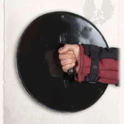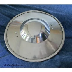 Deze schildknop is gemaakt van 2 mm dik staal en wordt geleverd inclusief klinknagels ter bevestiging. Hij heeft een diameter van 19 cm en een bolling van 12,5 cm breed en 6,5 cm hoog. Gewicht circa 500 gram.