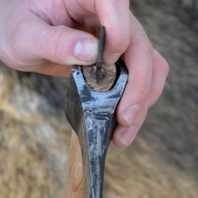 Na intensief gebruik kunnen bijlkoppen losraken van de schacht. Je kunt de bijlkop opnieuw vastzetten aan de schacht met deze spie. Sla de spie in de bovenkant van de houten schacht in de richting van de nerf. Hierdoor zet het hout uit waardoor de bijlkop strakker komt te zitten. Deze spie is vervaardigd van handgesmeed staal. Een perfecte tool voor de historische doe-het-zelver!