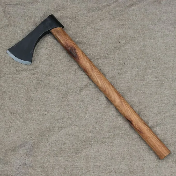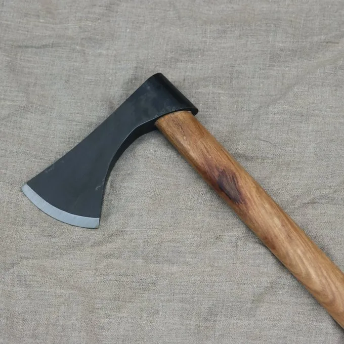 Materiaal: 1065 getemperd koolstofstaal, hout / Hardheid: 48 – 52 HRC / Snede: semi-scherp. / Lengte: 48 cm / Formaat bijlkop: 15,9 x 7,8 x 3 cm / Balanspunt: 2 cm onder bijlkop / Gewicht: 886 g / Gebaseerd op een historisch origineel